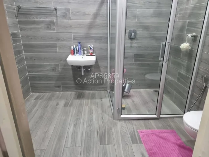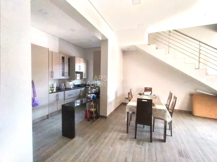 Comprising a small single bedroom downstairs with its own shower and toilet. Combined lounge and dining area, open plan with the fitted kitchen with gas stove. Upstairs has an informal central lounge, 3 bedrooms with mes, family shower and toilet. Small storeroom/laundry room. 2 solar geysers per unit. Complex is secure with high perimeter wall with electric fence and gate. The complex is serviced with a borehole and good security lighting.